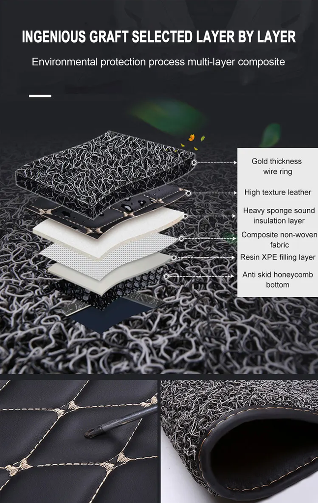 CM03 Double layer Luxury 3D Car Mats Set Black Red Line Leather + Red Wire Ring